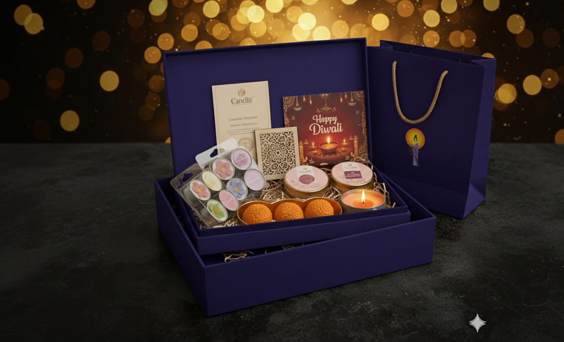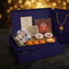 Celebrate Diwali with this lavish hamper, blending festive sweets, elegant candles, and decorative candle holders. With floating Daisy candles, a large Peony candle, and a Rasmalai-scented bowl, this hamper adds light, fragrance, and sweetness to your celebrations. Perfect for family, friends, or corporate gifting, it comes in a premium gift pack ready to impress.