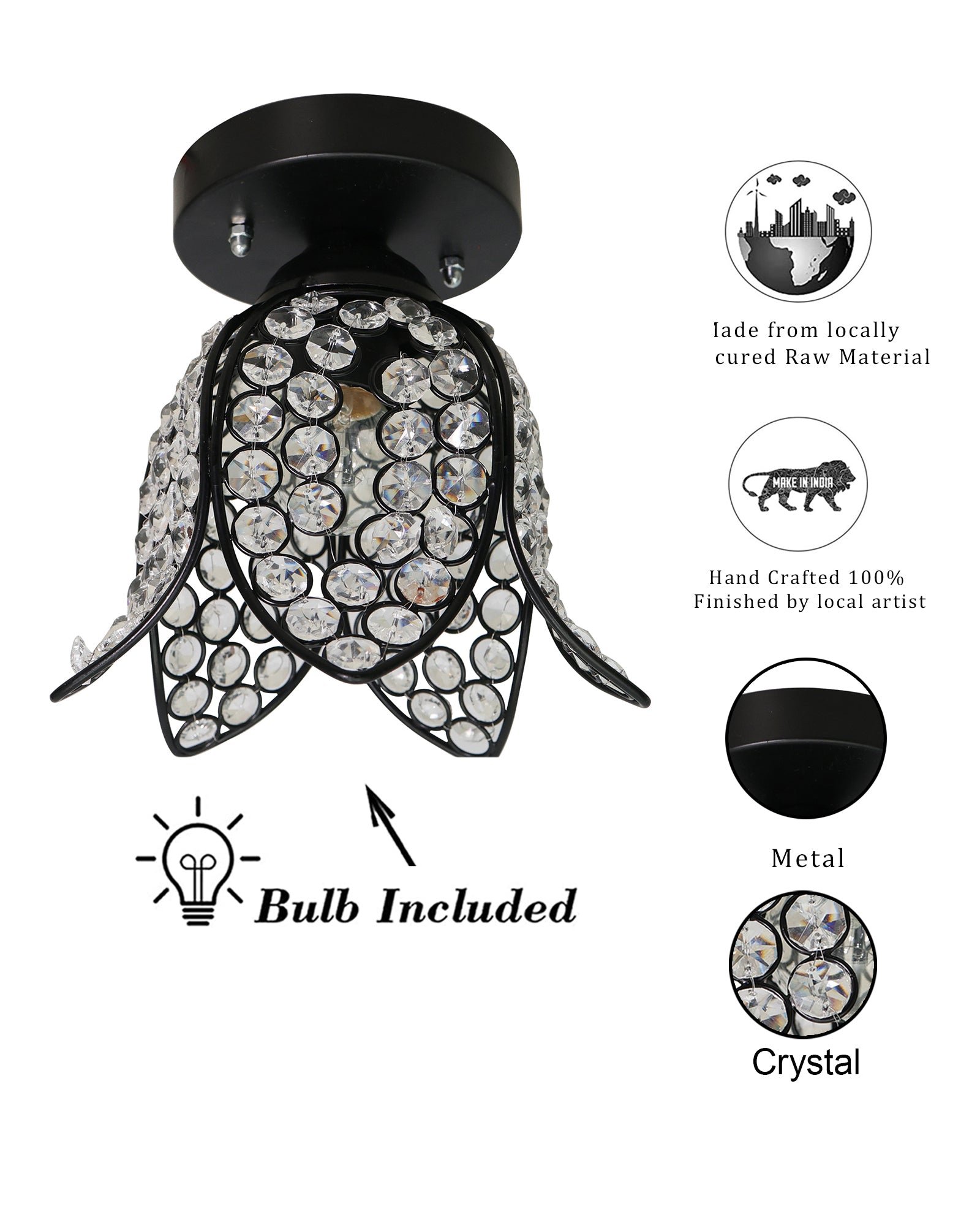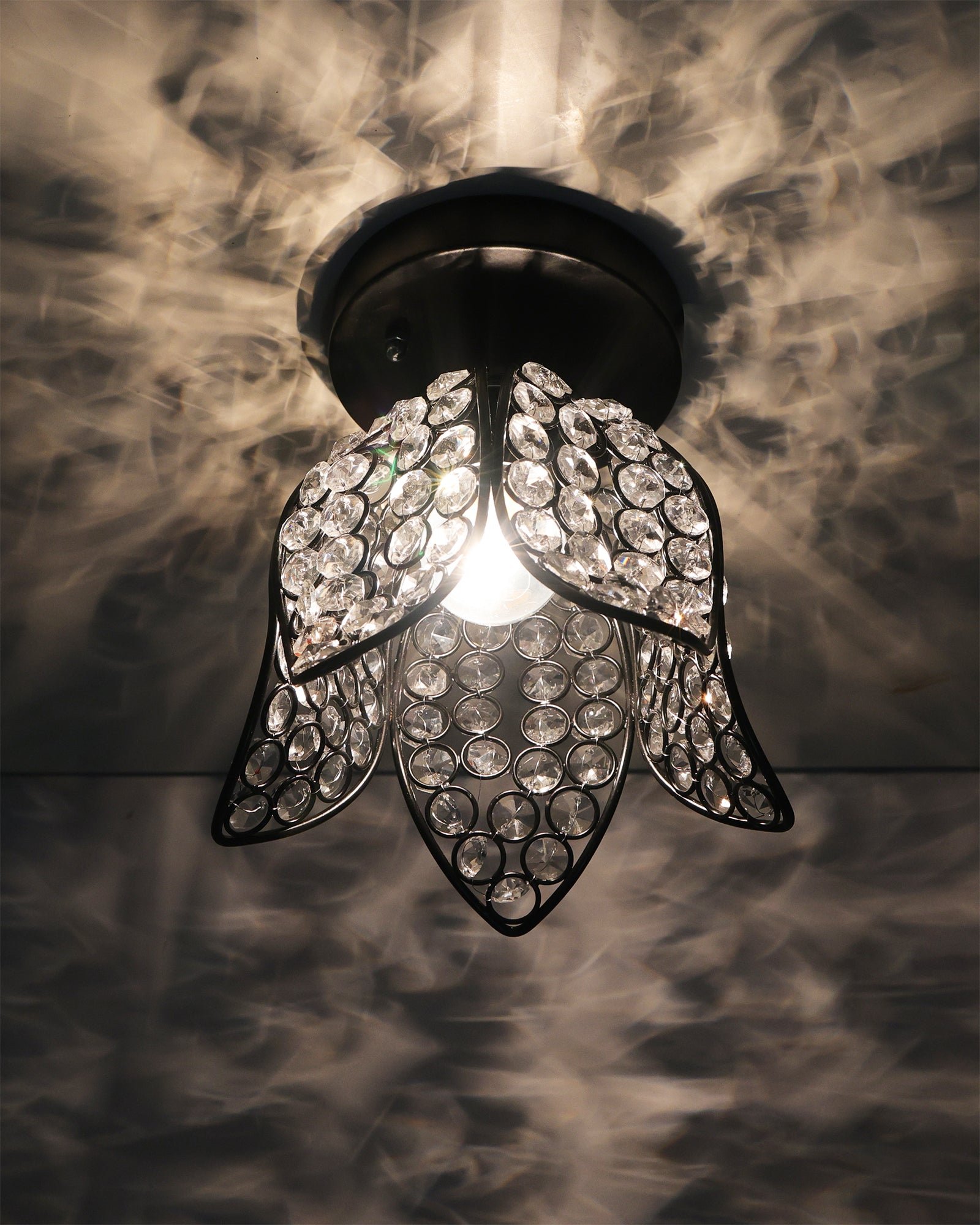 Elevate the ambiance of any room with the Metal Lotus Crystal Flush Mount Ceiling Light. Designed to blend modern elegance with timeless charm, this ceiling light features a beautifully crafted metal lotus frame adorned with sparkling crystals that reflect light in a stunning display. Perfect for living rooms, bedrooms, hallways, or dining areas, it adds a touch of sophistication and glamour to your home décor. Its flush mount design ensures a sleek, low-profile installation that complements any ceiling style.