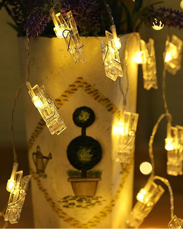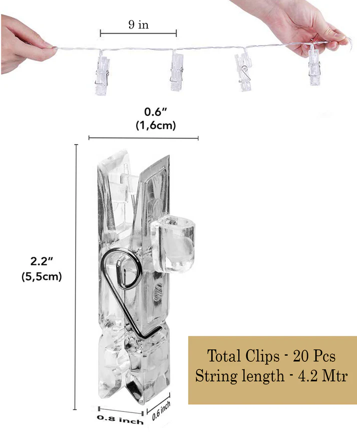Brighten up your space with our 20 Photo Clip LED String Lights—the perfect blend of décor and memories. Designed with sturdy plastic clips and warm white LEDs, these lights allow you to display your favorite photos while adding a cozy, festive glow. With a length of 4.2 meters, it’s ideal for decorating bedrooms, patios, restaurants, weddings, birthdays, and festivals. Easy to hang and battery-operated, these string lights bring charm to any corner of your home or event.